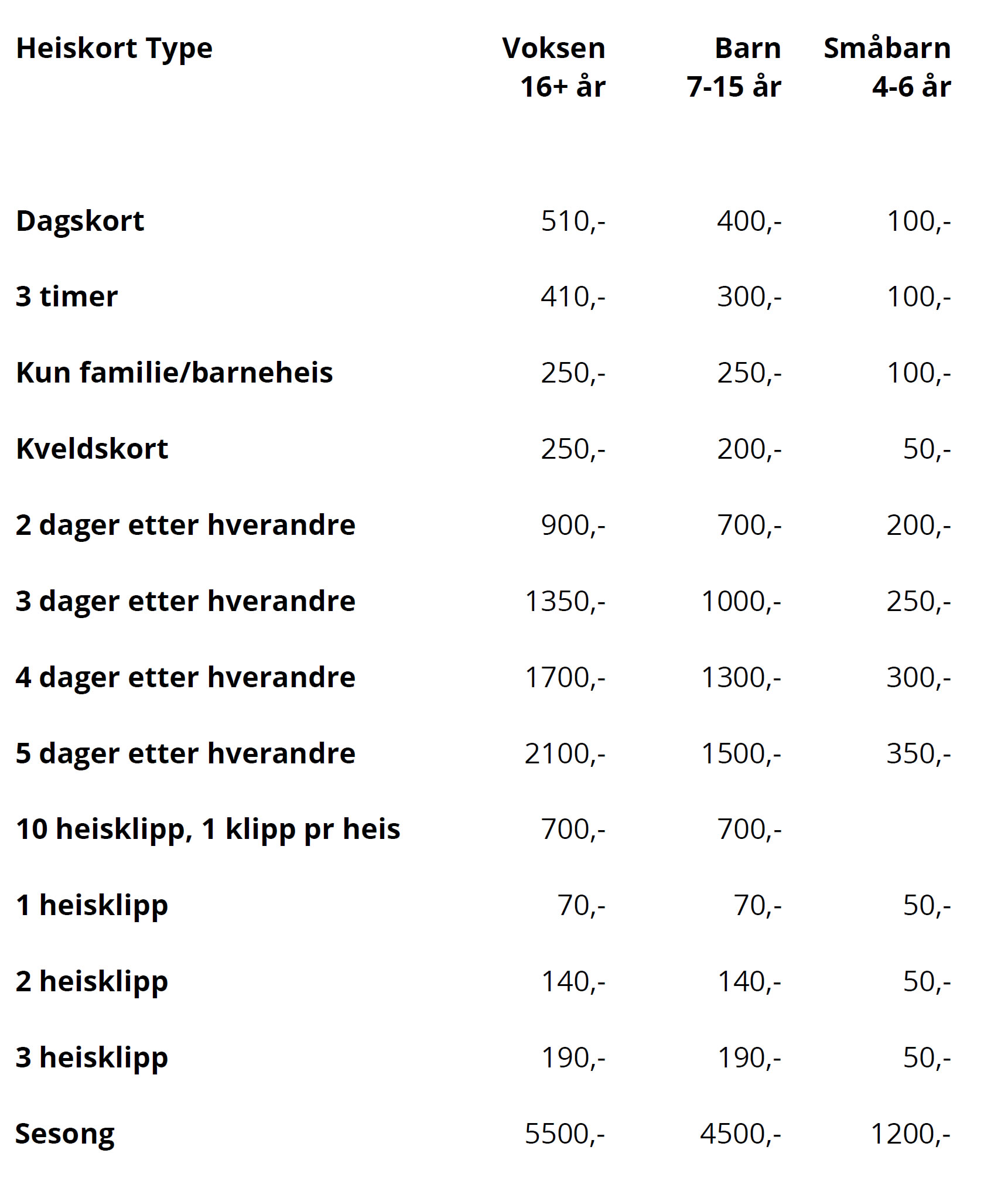 Flere dagers kort er påfølgende dager. Ledsager betaler barnepris på dagskort ved gyldig ledsagerbevis.